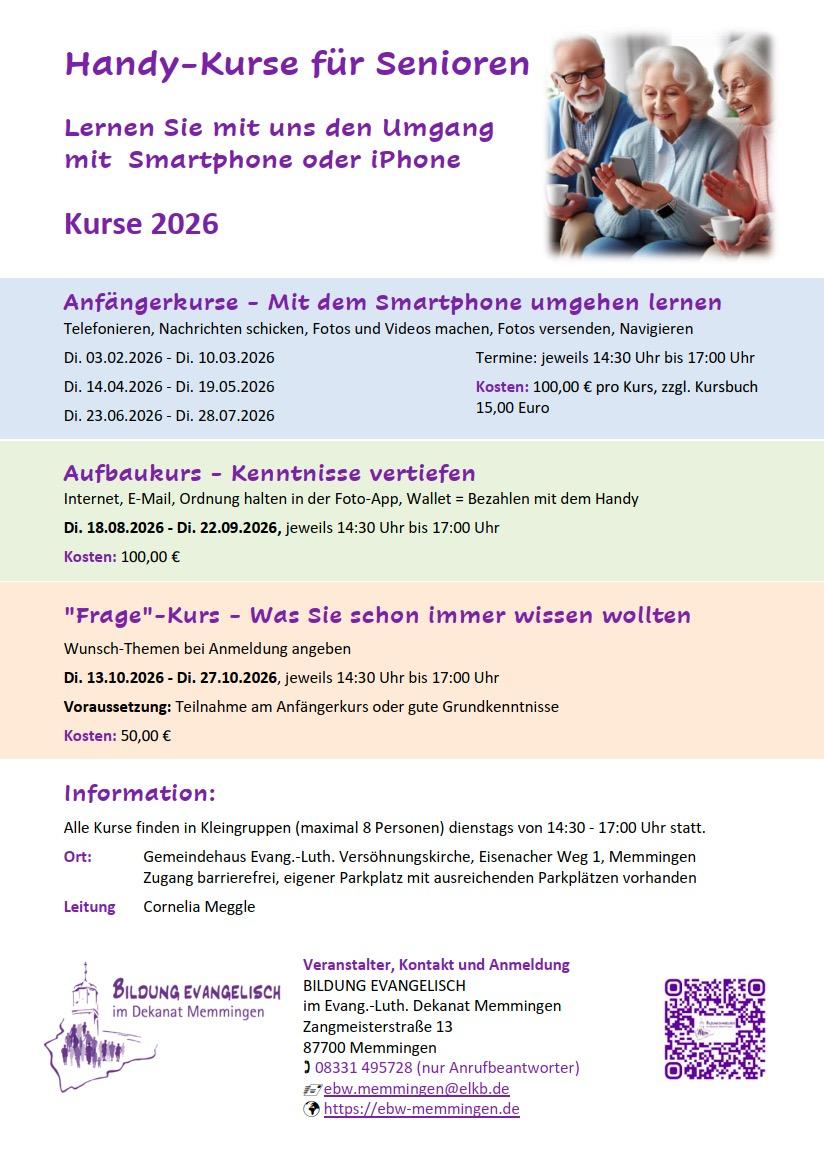 Für BILDUNG EVANGELISCH im Dekanat Memmingen (= das Bildungsangebot des Evangelisch-Lutherischen Dekanats Memmingen) gebe ich als Referentin "Handy"-Kurse für Senioren und Seniorinnen.